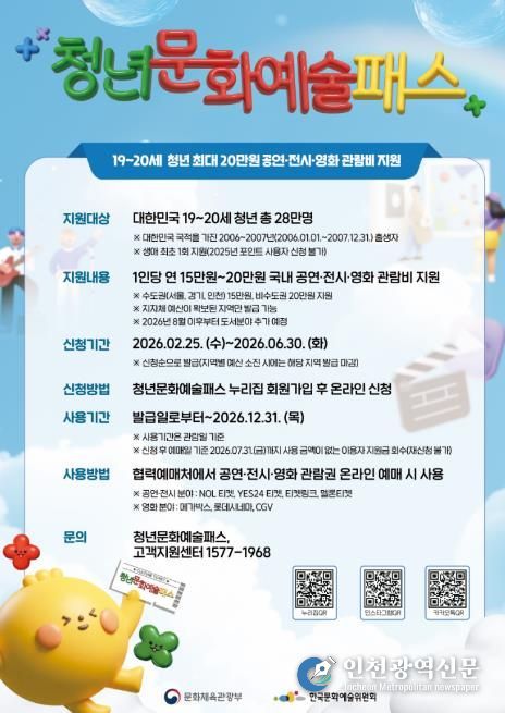 ‘청년문화예술패스’는 19~20세 청년에게 협력 예매처에서 즉시 사용할 수 있는 공연․전시․영화의 관람비를 포인트로 지원하는 사업이다.