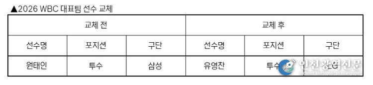 [인천광역신문] 관리자 기자 | KBO 전력강화위원회는 부상으로 인해 WBC 참가가 어려워진 삼성 원태인을 대체할 선수로 LG 유영찬을 확정하고 WBC 조직위에 선수 교체 승인을 요청했다.