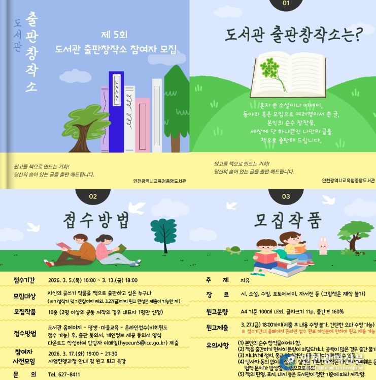 출판 경험이 없는 시민을 대상으로 3월 5일부터 13일까지 선착순 모집하며, 자세한 사항은 중앙도서관 정보자료과(032-627-8411)로 문의하면 된다.