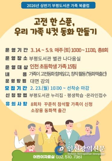 [인천광역신문] 관리자 기자 | 인천광역시교육청부평도서관은 가정 내 독서문화 형성을 위한 ‘고전 한 스푼, 우리 가족 4컷 동화 만들기’ 참여 가족을 모집한다.