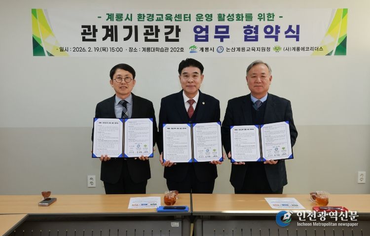 [인천광역신문] 관리자 기자 | 충남 계룡시는 지난 19일 계룡대학습관에서 논산계룡교육지원청, 환경교육센터(계룡에코리더스)와 함께 지역 환경교육 활성화를 위한 업무협약을 체결하고 현판 제막식을 개최했다.