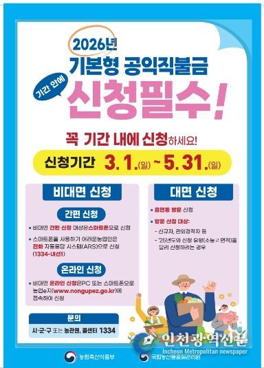 [인천광역신문] 관리자 기자 | 부평구가 오는 3월 1일부터 5월 31일까지 2026년 기본형 공익직불금 등록 신청을 접수한다.