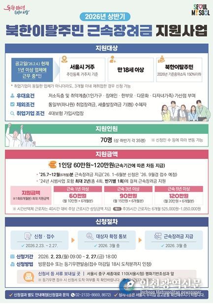 [인천광역신문] 관리자 기자 | 서울시는 지자체 최초로 2024년 시범 시행을 거쳐 2025년 정식 실시한 ‘북한이탈주민 근속장려금 지원사업’을 올해 한층 강화해 운영에 나선다.