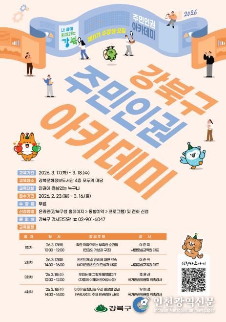 [인천광역신문] 관리자 기자 | 서울 강북구는 생활 속 인권 존중 문화를 확산하고 인권 친화적 지역사회를 조성하기 위해 ‘2026년 제11기 강북구 주민 인권아카데미’를 운영한다고 밝혔다.