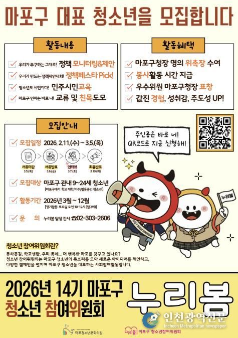 [인천광역신문] 관리자 기자 | 마포구는 청소년이 정책의 대상이 아닌 정책의 주체로 참여할 수 있도록 제14기 마포구 청소년참여위원회 ‘누리봄’ 위원을 모집한다.