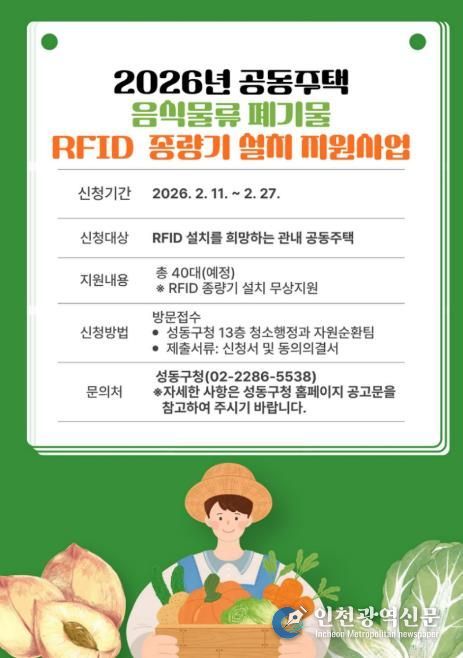 [인천광역신문] 관리자 기자 | 서울 성동구는 공동주택의 음식물류 폐기물 감량과 배출 편의 증진을 위해 음식물류 폐기물 RFID 종량기 설치 지원사업을 추진한다고 밝혔다.