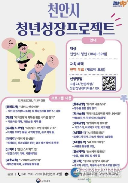 참여 대상은 시에 거주하는 18~ 39세 청년으로, 신청은 천안청년센터 이음누리집에서 선착순으로 진행된다.