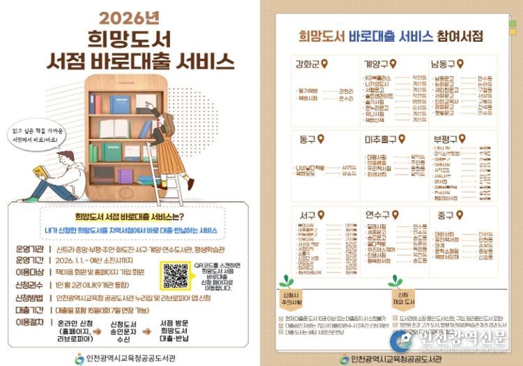 중앙도서관 관계자는 “희망도서 서점 바로대출 서비스는 시민들이 보고 싶은 책을 가장 빠르고 편하게 접할 수 있는 방법”이라며 “앞으로도 지역 서점과의 상생을 도모하고, 인천 시민의 독서 문화 확산을 위해 노력하겠다”라고 전했다.
