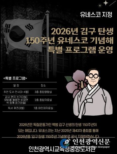 [인천광역신문] 관리자 기자 | 인천광역시교육청중앙도서관은 ‘김구 탄생 150주년 유네스코 기념의 해’를 맞아, 백범 김구 선생의 삶과 정신을 기리고 시민의 역사의식을 함양하기 위한 기념행사를 3월부터 8월까지 운영한다.