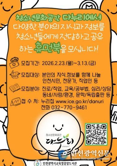 모집은 인천 시민 중 전문 지식이나 독특한 이력을 가진 직업인, 예술가 등을 대상으로 하며, 다누리 누리집에서 2월 23일부터 3월 13일까지 신청할 수 있다.