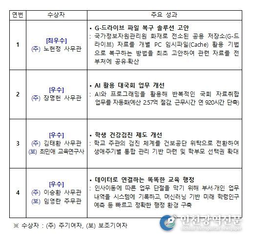 ‘최우수’는 노현정 사무관이 수상하며 500만 원의 포상금을 받았다. 작년 국가정보자원관리원 화재 당시, 전 부처의 공용 저장소(G-드라이브)의 자료가 사라질 위기에 처했다. 이에 노사무관은 전산직이 아님에도 해결법을 고민하여, 개별 컴퓨터에 남아 있는 임시 저장파일(Cache)로 자료를 복구하는 방법을 최초로 만들어냈다. 이 방법은 전 부처에 공유되어 행정안전부, 인사혁신처 등 자료 손실로 피해가 컸던 부처에서 자료를 되살리는 데 중요한 역할을 했다.