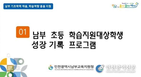 [인천광역신문] 관리자 기자 | 인천남부교육지원청은 지난 23일 관내 초등학교 54교에 기초학력 보장지원을 위한 ‘초등 학습지원대상학생 성장기록 프로그램’을 보급했다.