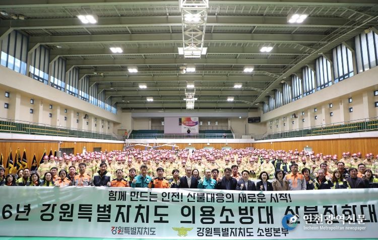 [인천광역신문] 관리자 기자 | 강원특별자치도는 2월 24일 원주에서 김진태 도지사와 김시성 도의회 의장을 비롯한 도의원, 관계기관장, 의용소방대원 등 800여 명이 참석한 가운데 전국에서 두 번째 사례로 '강원특별자치도 의용소방대 산불진화대 발대식'을 개최했다고 밝혔다.