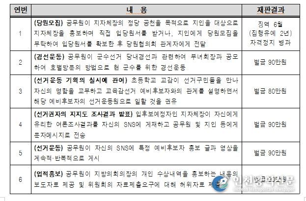 [인천광역신문] 관리자 기자 | 중앙선거관리위원회는 제9회 전국동시지방선거를 앞두고 공무원 및 산하기관 직원 등의 불법 선거관여행위에 대한 예방·단속활동을 강화하고 있다고 밝혔다.