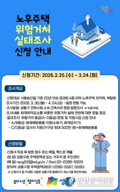 [인천광역신문] 관리자 기자 | 서울 성동구는 지난해 전국 최초로 도입해 큰 성과를 거둔 ‘위험거처 실태조사’ 대상을 20년 이상 노후주택으로 확대해 주거개선 지원사업을 추진한다고 밝혔다.