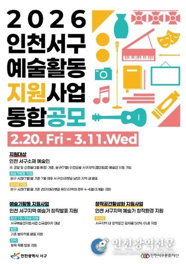 [인천광역신문] 관리자 기자 | (재)인천서구문화재단은 2월 20일부터 3월 11일까지 2026년 인천서구 ‘예술활동지원사업’ 통합공모를 추진한다.