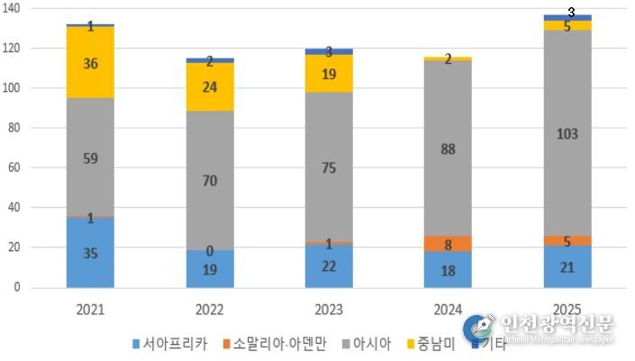 [인천광역신문] 관리자 기자 | 해양수산부는 2월 25일 ‘2025년 전 세계 해적사건 발생 동향’을 발표했다. 2025년 전 세계 해적사건은 2024년보다 증가(116→137건)했으나 승선자 피해는 감소(151→88명)했으며, 우리 국민과 선박에 대한 피해는 발생하지 않았다.