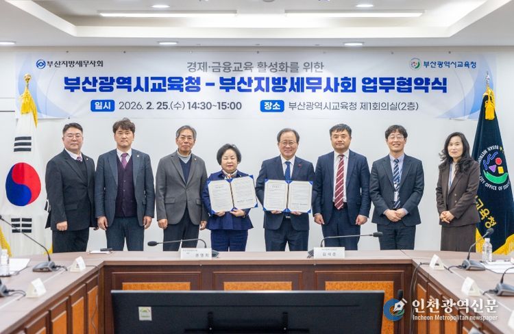 [인천광역신문] 관리자 기자 | 부산광역시교육청은 25일 오후 교육청 회의실에서 부산지방세무사회(회장 권영희)와 초·중등 학생들의 경제·금융 교육 역량 함양을 위한 업무협약(MOU)을 체결했다.