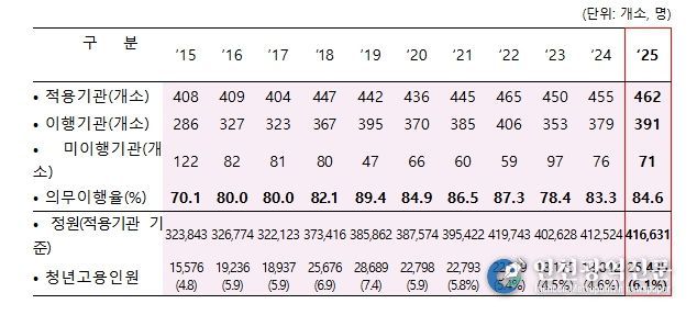 2025년 공공기관 청년고용의무 이행결과에 따르면, 적용기관 462개소의 84.6%(391개소)가 청년고용의무를 이행한 것으로 조사되어 2024년(83.3%, 379개소) 대비 1.3%p(+12개소) 증가했다.
