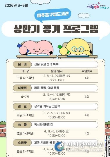 [인천광역신문] 관리자 기자 | 인천 미추홀구 구립도서관은 오는 3월부터 5월까지 운영되는 상반기 정기 프로그램의 수강생을 모집한다고 밝혔다.