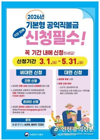 [인천광역신문] 관리자 기자 | 인천광역시 계양구는 2026년도 기본형 공익직불금 등록 신청을 오는 3월 1일부터 5월 31일까지 접수한다고 밝혔다.