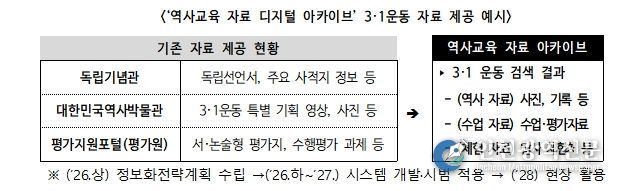 또한, 학생의 탐구 역량을 키우는 역사 수업 활성화를 위해 ‘탐구 중심 역사 교육과정 운영 사례집’(’26. 3종→’27. 9종)을 개발·보급한다. 더불어, 각종 기관·누리집(플랫폼) 등에 분산된 근현대 사료와 교육자료, 체험 자료 등을 수업에 즉시 활용할 수 있도록 교사에게 묶음(패키지) 형태로 제공하는 ‘역사교육 자료 아카이브’를 구축(ʹ27)할 예정이다.