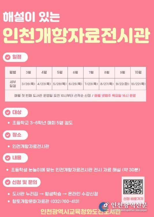 [인천광역신문] 관리자 기자 | 인천광역시교육청화도진도서관은 3월부터 10월까지 관내 초등 3~6학년을 대상으로, 향토 문화와 역사의 가치를 알리기 위한 ‘인천개항자료전시관’전시 해설 프로그램을 운영한다.