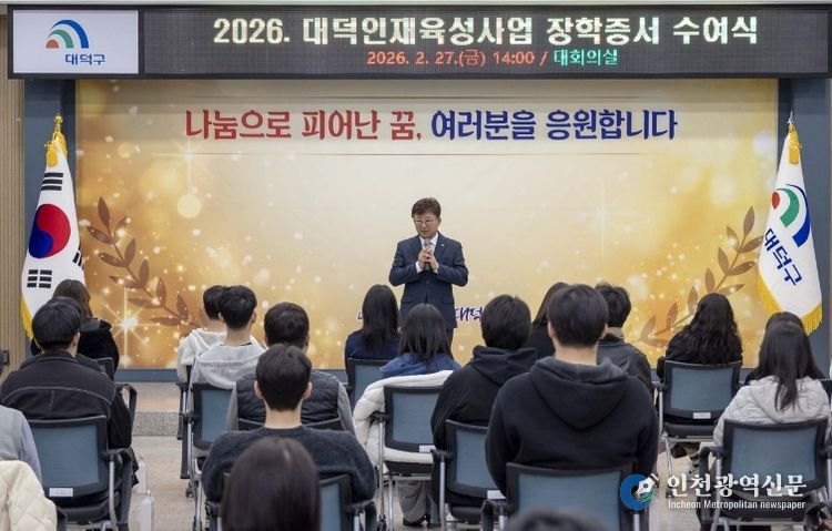 ![최충규 대덕구청장이 27일 구청 대회의실에서 열린 ‘대덕인재육성사업’ 장학증서 전달식에서 장학생들에게 격려의 말을 전하고 있다.]](/data/photos/portnews/202602/20260227144410-10068.jpg)