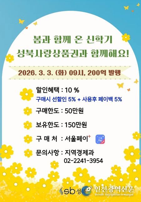[인천광역신문] 관리자 기자 | 서울 성북구가 다가오는 신학기를 맞아 가계 부담 완화와 지역 소상공인 매출 증대를 위해 오는 3월 3일(화) 오전 9시부터 200억 원 규모의 ‘성북사랑상품권’을 발행한다.