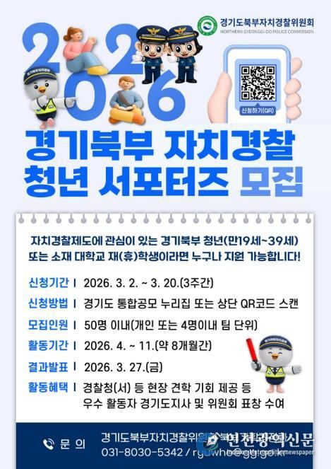 [인천광역신문] 관리자 기자 | 경기도북부자치경찰위원회는 자치경찰제에 대한 청년층의 관심을 높이고 현장 중심 치안 활동을 함께할 ‘2026 경기북부 자치경찰 청년 서포터즈’를 3월 2일부터 20일까지 공개 모집한다.
