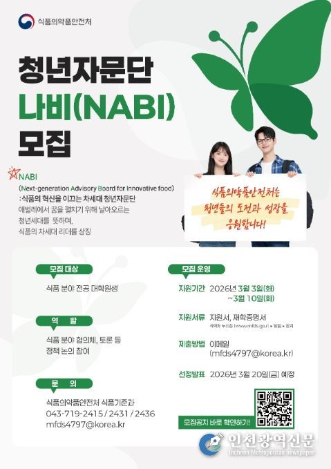 [인천광역신문] 관리자 기자 | 식품의약품안전처는 청년층이 식품 정책 논의 과정에 직접 참여할 수 있도록 지원하는 제1기 청년자문단 ‘나비’를 3월 3일부터 3월 10일까지 공개 모집한다고 밝혔다.