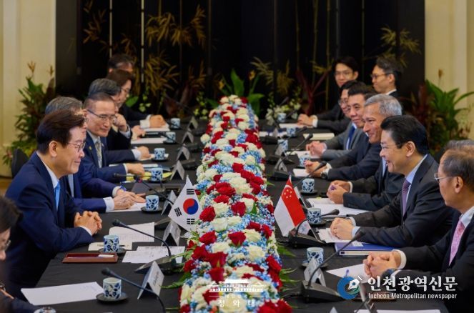 [인천광역신문] 관리자 기자 | 싱가포르를 국빈 방문 중인 이재명 대통령은 3월 2일 오전 '로렌스 웡(Lawrence Wong)' 싱가포르 총리와 정상회담을 갖고 양국 간 전략적 동반자 관계 심화 방안과 한반도 및 중동정세 등 주요 국제 현안에 대해 폭넓게 논의했다.