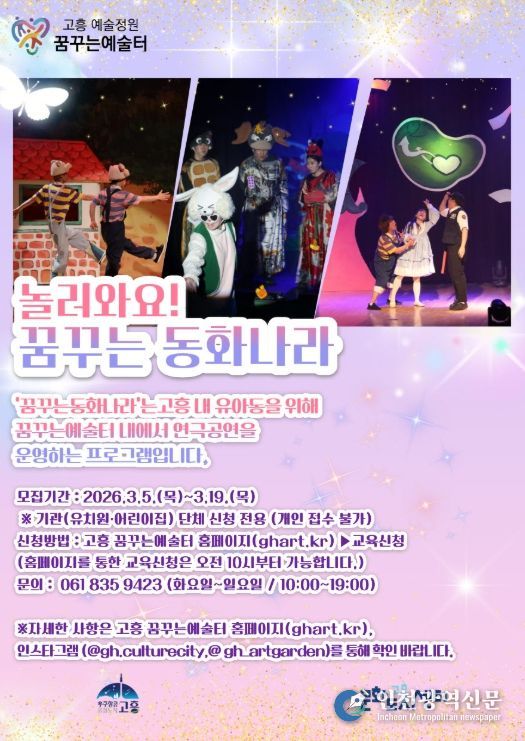 특히 이번 프로그램은 유치원과 어린이집 단위의 단체 관람으로만 운영되며, 개인 신청이나 개별 관람은 불가하다. 관람을 희망하는 관내 교육기관은 모집 기간 내 고흥 꿈꾸는예술터 홈페이지(ghart.kr)를 통해 신청하면 된다.