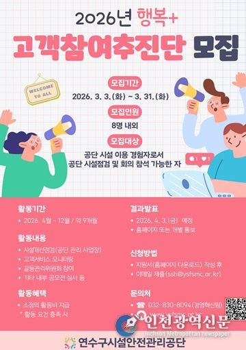 [인천광역신문] 관리자 기자 | 연수구시설안전관리공단이 고객 중심의 경영을 실현하고 시설 운영의 투명성을 높이기 위해 ‘2026년 행복+고객참여추진단’을 모집한다고 밝혔다.