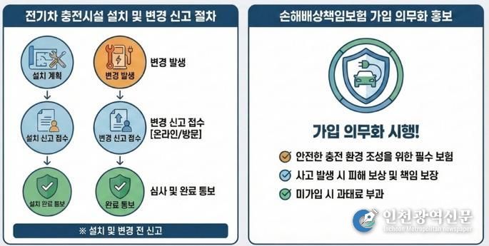 [인천광역신문] 관리자 기자 | 파주시는 '전기안전관리법' 개정에 따라 전기자동차 충전시설의 설치·변경 신고와 손해배상책임보험 가입이 의무화됨에 따라, 관내 충전시설 관리자와 건축물 소유자 등이 관련 규정을 기한 내 이행할 것을 당부했다.