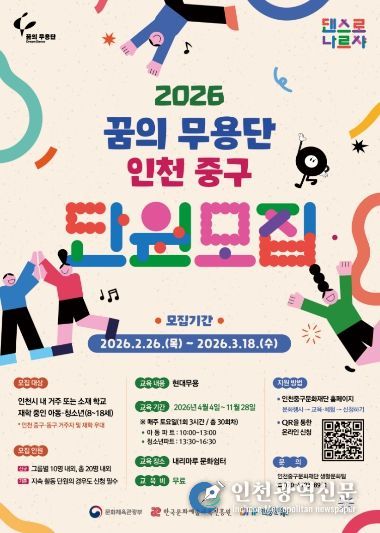 [인천광역신문] 관리자 기자 | (재)인천중구문화재단(이사장 김정헌)은 2026 꿈의 무용단 ‘인천 중구’의 신규 단원을 모집한다고 4일 밝혔다.