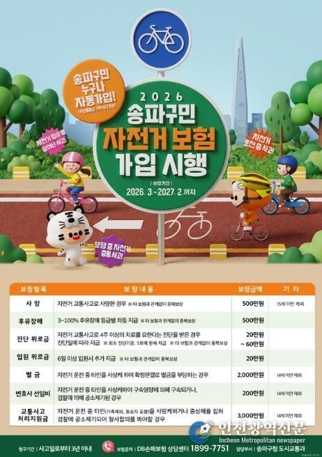 [인천광역신문] 관리자 기자 | 서울 송파구가 구민들의 안전한 자전거 이용 환경조성을 위해 올해도 전 구민을 대상으로 ‘자전거 보험’을 운영한다고 밝혔다.