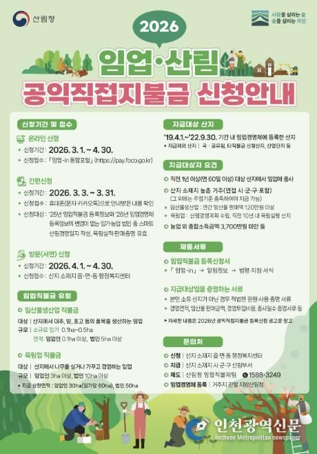 [인천광역신문] 관리자 기자 | 봉화군은 산림의 공익기능 증진과 임업인의 소득 안정을 위해 3월 4일부터 4월 30일까지 ‘2026년 임업·산림 공익직접지불금’ 신청을 접수한다고 밝혔다.