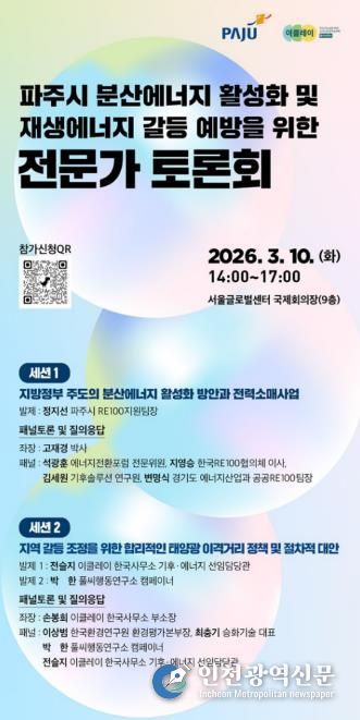 [인천광역신문] 관리자 기자 | 파주시는 이클레이(ICLEI) 한국사무소와 함께 오는 10일 서울글로벌센터 국제회의장에서 ‘분산에너지 활성화 및 재생에너지 갈등 예방을 위한 전문가 토론회’를 개최한다.
