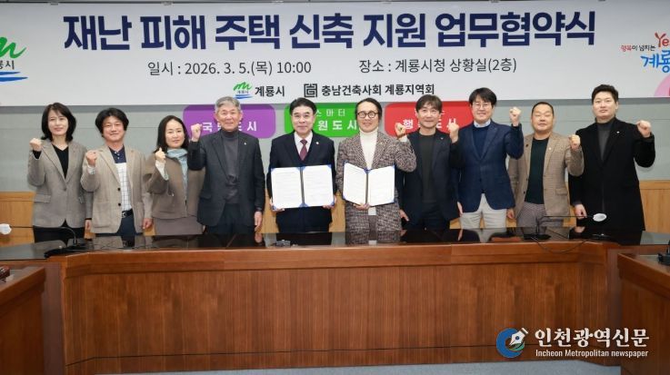 [인천광역신문] 관리자 기자 | 충남 계룡시는 5일 시청 상황실에서 충남건축사회 계룡지역회(회장 류욱형)와 ‘재난 피해 주택 신축지원을 위한 업무협약’을 체결했다고 밝혔다.