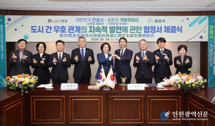 [인천광역신문] 관리자 기자 | 안성시는 2026년 3월 4일 오전 11시 안성시청 본관 2층 상황실에서 일본 가나가와현 가마쿠라시(시장 마쓰오 다카시)와 '도시 간 우호 관계의 지속적 발전에 대한 협정'을 체결하고 양 도시 간 문화·예술 및 청소년 분야 교류를 본격 추진하기로 했다.