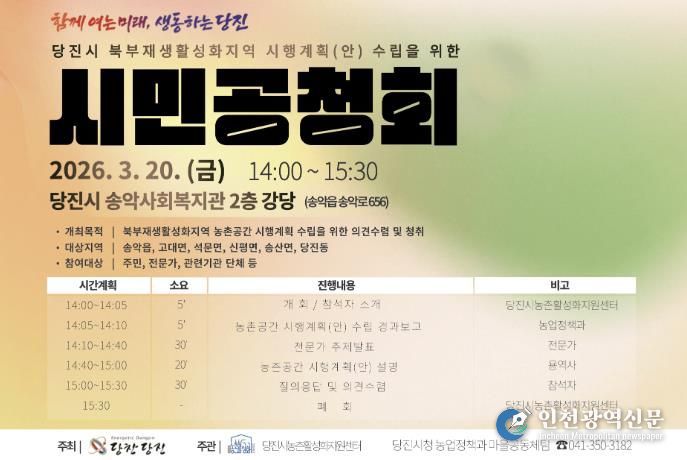[인천광역신문] 관리자 기자 | 당진시는 오는 20일 오후 2시 송악사회복지관(송악읍 송악로 656)에서 북부농촌재생활성화지역*을 대상으로 수립한‘농촌 공간 재구조화 및 재생 시행계획(안)’에 대한 공청회를 개최한다고 6일 밝혔다.