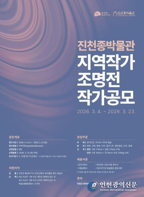 [인천광역신문] 관리자 기자 | 충북 진천종박물관이 지역 예술인의 창작활동을 지원하고 지역 문화예술의 저변을 넓히기 위해 ‘지역작가 조명전: 틈새갤러리’참여 작가를 공개 모집한다.