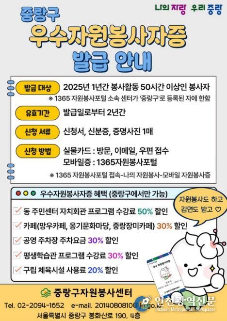 [인천광역신문] 관리자 기자 | 중랑구가 자원봉사자의 헌신과 노고에 대한 예우를 강화하기 위해 ‘모바일 우수자원봉사자증’ 발급을 시행하고 다양한 혜택을 제공한다. 모바일 기반 발급 체계 구축과 함께 실질적인 인센티브를 내실화해 자원봉사 참여 동기를 높이고, 지역 내 자원봉사 문화 확산을 도모하기 위함이다.