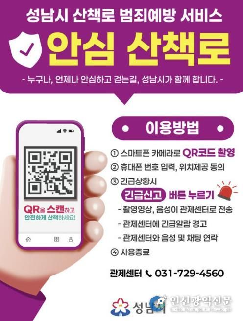 [인천광역신문] 관리자 기자 | 성남시는 시민들이 보다 안심하고 산책로를 이용할 수 있도록 영장산과 불곡산 일대 산책로에 ‘범죄예방 서비스’를 6일부터 도입한다.