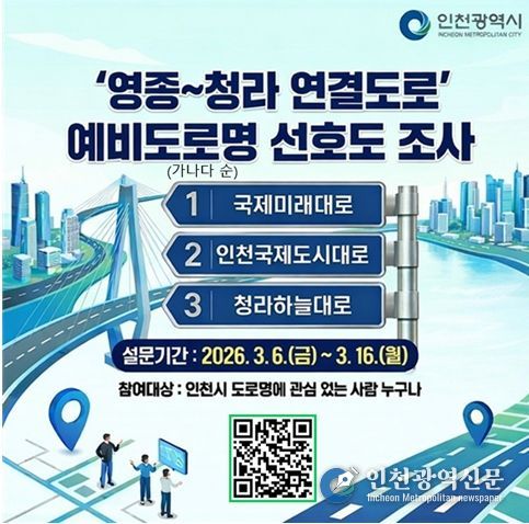 선호도 조사는 인천시 누리집을 통해 온라인으로 참여할 수 있으며, 후보안은 ▲두 국제도시의 미래 비전을 담은 ‘국제미래대로’ ▲영종국제도시와 청라국제도시를 연결한다는 의미의 ‘인천국제도시대로’ ▲청라하늘대교 명칭을 반영한 ‘청라하늘대로’ 등 3가지다. 시민은 제시된 안 가운데 하나를 선택하거나 새로운 이름을 직접 제안할 수 있다.