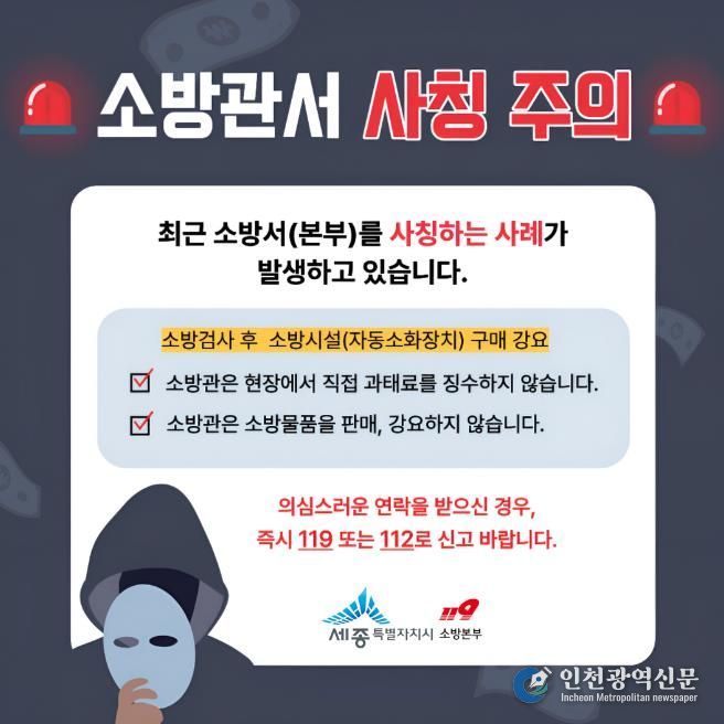 [인천광역신문] 관리자 기자 | 최근 세종소방본부를 사칭해 소방용품 구매를 강요하는 사기 시도가 잇따르고 있어 시민들의 각별한 주의가 요구된다.