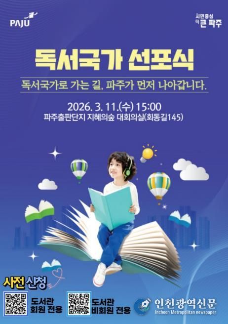[인천광역신문] 관리자 기자 | 파주시는 오는 11일 15시, 파주출판도시 지혜의숲 대회의실에서 ‘파주시 독서국가 선포식’을 개최하고 책 읽는 도시를 넘어 ‘독서국가’로 나아가기 위한 힘찬 출발을 알린다.