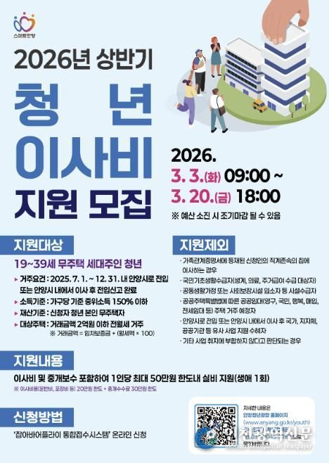 [인천광역신문] 관리자 기자 | 안양시는 청년가구의 초기 정착비용 부담 완화를 위해 이사비용을 최대 50만원까지 지원하는 ‘청년가구 이사비 지원’ 사업을 올해도 시행한다고 6일 밝혔다.