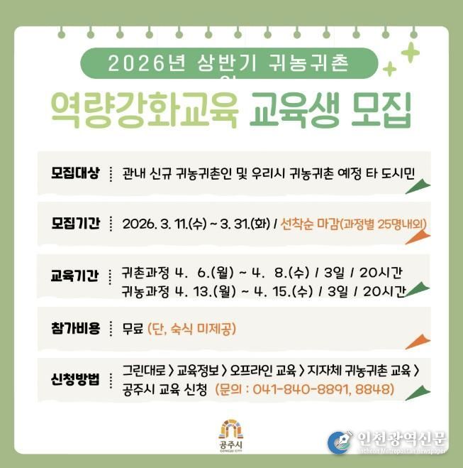 [인천광역신문] 관리자 기자 | 공주시는 2026년 상반기 귀농·귀촌인 역량 강화 교육에 참여할 교육생 50명을 오는 11일부터 모집한다고 밝혔다.